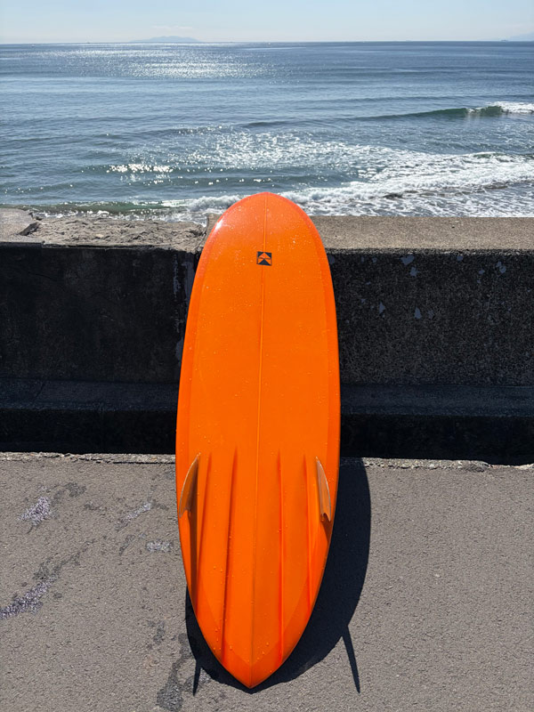 6’0のホットマンゴー、トライフィン。活さんが日本に戻って「カツカワミナミサーフボード」を再開されたときの最初のモデルです。私も最初にシェイプしていただきました。