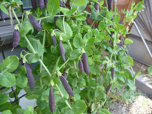 えんどう豆。さやがムラサキ色の品種です。まだ背は低いですが、さやの中では育っています。ぷっくりしたのを収穫しました。