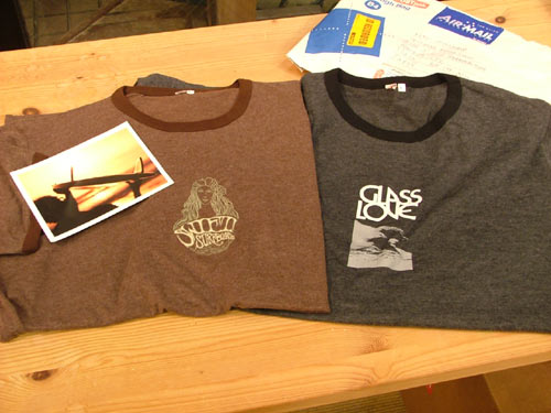 ポストの中にAIR MAILと書かれたしわくちゃの包みが入っていたので開けてみると、オーストラリアのアンドリュー・キッドマンからの小包でした。中身は二枚のTシャツとエーテルのポストカード。