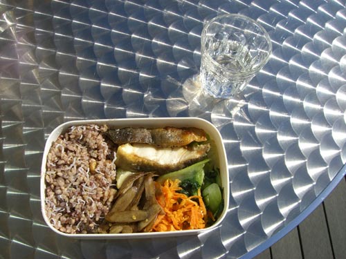 朝は冷え込みましたが風さえ避ければ日差しは暖かいです。今日は家のテラスで弁当を食べてきました。日向はTシャツ一枚で平気な暖かさ。今日はいつものチリメン玄米豆ご飯にホッケの塩焼き、青梗菜にゴボウのキンピラ、人参のピクルスです。