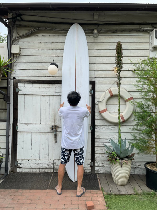 そんな状況ですが、最高と思えるボードを作っています。これです。TOTO 9’3”。プリモと同じで、これからずっと乗って行こうと思っているロングボードです。