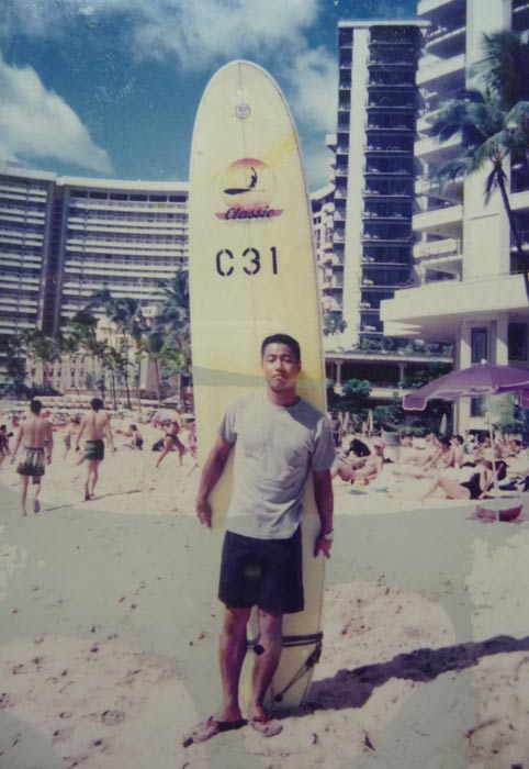 お約束のポーズで後ろに抱えているボードは、ビーチにあったレンタルボード。10フィートオーバーのビッグボードが面白くて、自分のボードを持っていてもよく借りて遊んでいました。