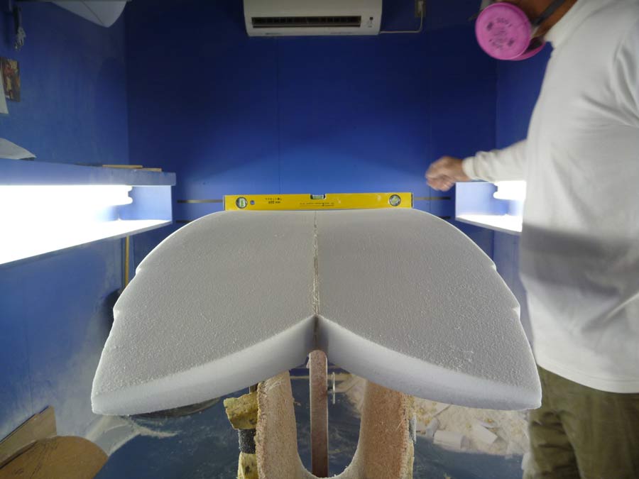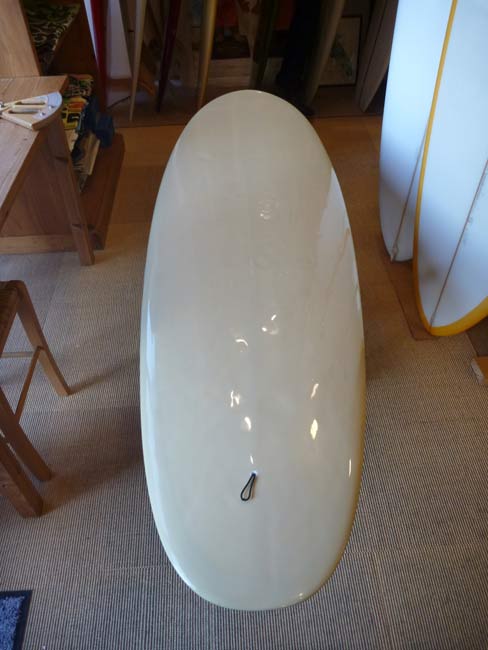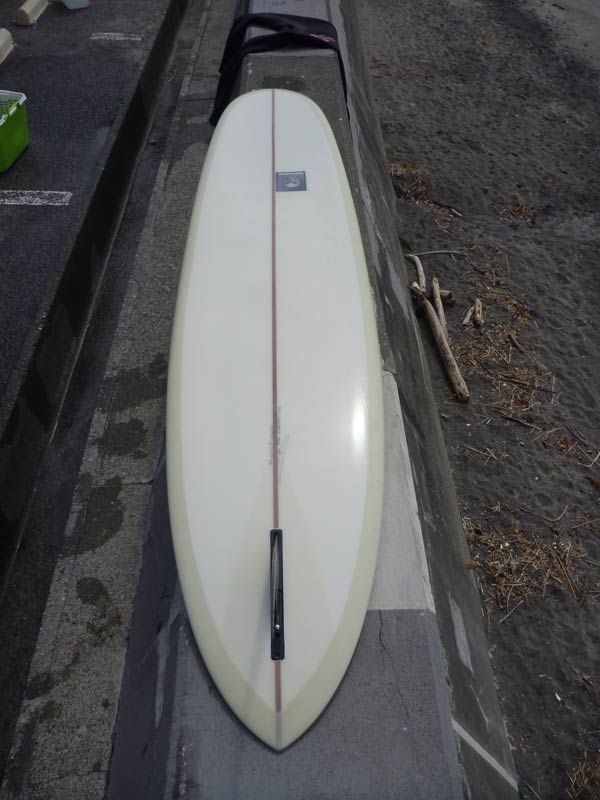 上のボードに話を戻しますと実はこのボード、少々実験的なシェイプでもありテールの幅が広すぎて、曲げるのが難しい板でした。その分、よーく走ったという記憶があります。(いくら走っても曲がらないと困りますから、皆さまにお作りしたソープ・スリッパーは改良されています。)