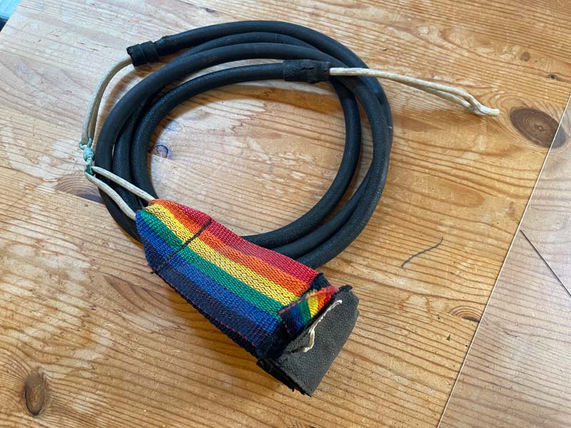 50年くらい前のリーシュが店にあります。コードはゴム管の中にナイロンのロープを通したもので、伸縮性があります。波に巻かれて伸びた後に、スプリングバックで思い切り自分の方へ飛んできそうです。足首もナイロンテープで痛そう。ボード側はただの輪っかなので、リーシュカップに着けっ放し。昔あった、ネジの頭が輪になっているフィンボルトに着けたかもしれません。