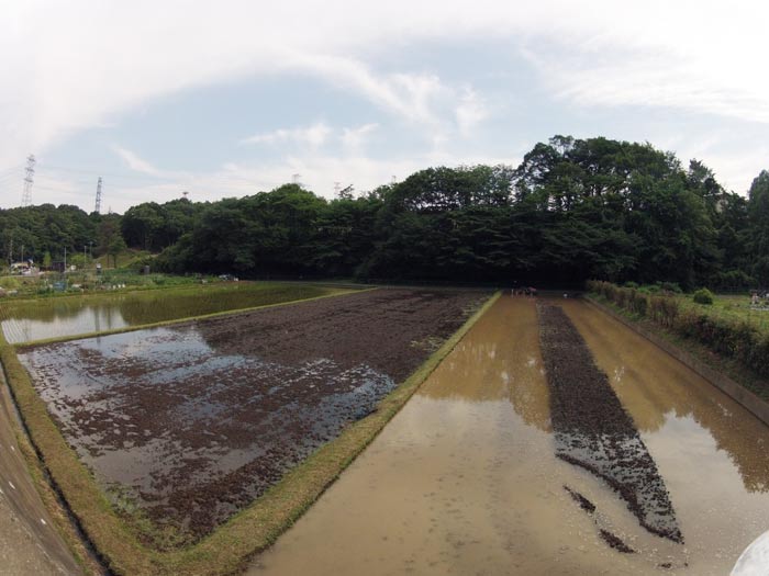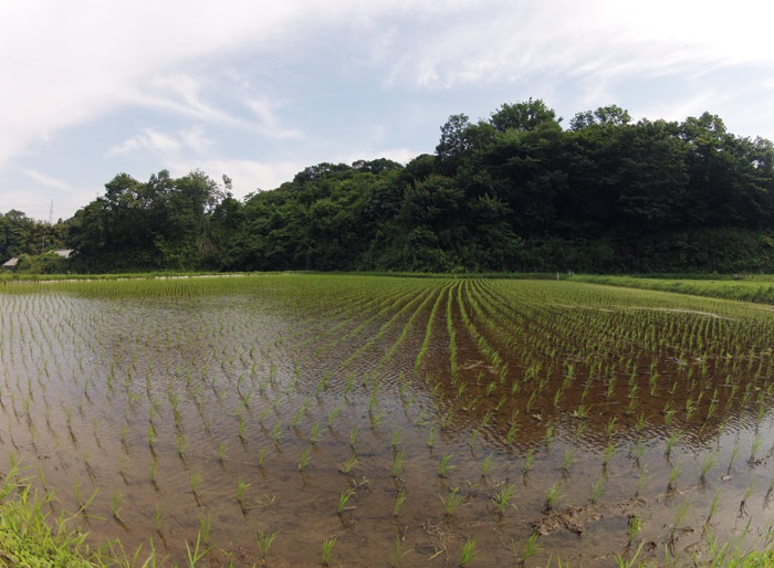 この田んぼは田植え終わっています。田んぼを吹いてくる風が気持ちいい。米が実り始めると吹いてくる風に米の香りが混ざります。写真では見えませんが向こう側のあぜ道でカモが毛づくろいをしていました。