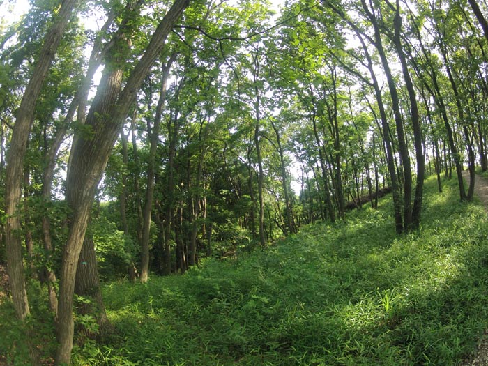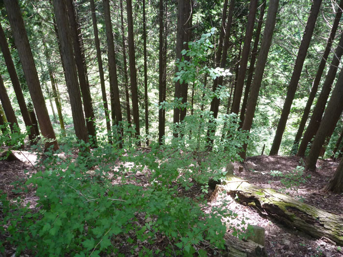 6キロほど歩くと、涼しい林道は終わり、目の前に斜面が現れます。