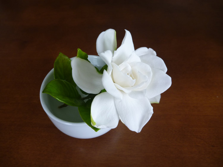 くちなしの花のつぼみを一輪摘んで活けておいたら、夜のうちにきれいに開きました。ちょっと熱帯の島を思わせる濃厚な香りが漂っています。