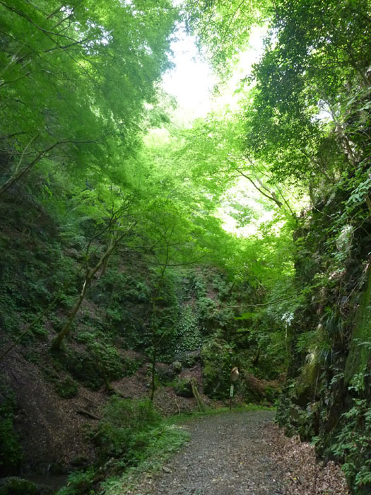 崖とモミジにかこまれて、まるでトンネルの中を歩いているみたいです。上流から涼しい風が吹いてがけ沿いに吹いてきます。