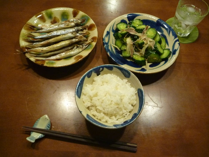 シシャモをたっぷり焼いて、たっぷりのキュウリの浅漬けと麦飯に焼酎。なんかワイルドだぜ。