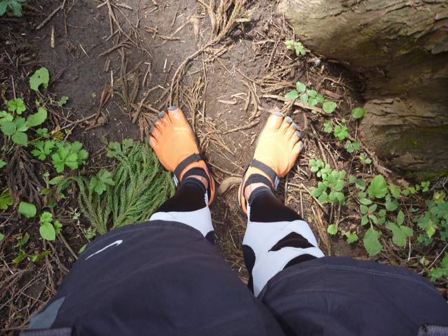 ファイブフィンガーズ、登りは調子いいし、ぬかるんで滑りそうな下りではソールがあるシューズよりも繊細に足の裏で路面の感触を確かめながら走れるのでなかなかゴキゲンなのですが、急な下りが大変。