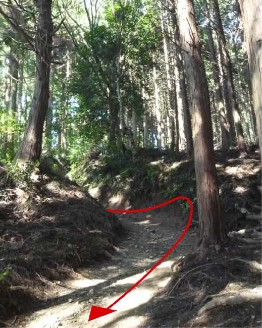 階段を登ると山頂ですが山頂は通らずに、左側のまき道を使って先へ進みます。
