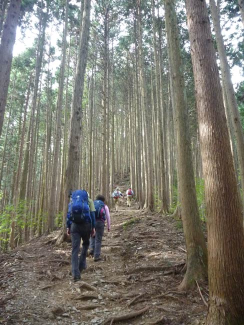 足元は杉や檜の葉が積もってふかふかで檜のいい香りが漂って、聞こえてくるのは鳥の鳴き声と自分の息づかいだけ。木々の間には遠くの山並みが見え隠れしています(よそ見注意ですが)