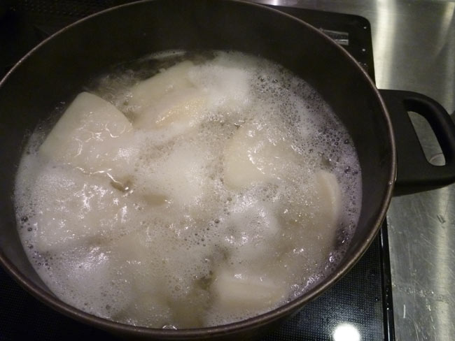 ざっと面取りをして隠し包丁を入れて下茹でです。白米をひとつまみ入れて水から茹でます。竹串がすっと入るようになったら茹で上がりです。
