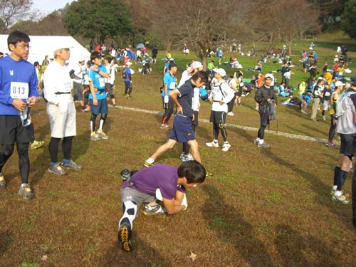 一人のランナーが「大丈夫ですか?」と立ち止まって足を見てくれます。痛みに耐えながら「両足、攣っちゃって…」と言うと「辛いですよね、ぼくもそろそろヤバイです」と言いながら足を持って筋肉を伸ばし、マッサージをしてくれました。