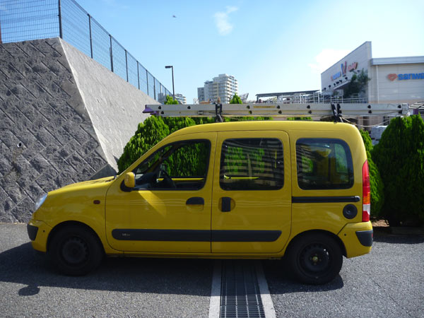 サーフボードではなく脚立を載せて…カングー本来の使われ方のひとつがこんな感じで職人さんの仕事クルマです。運転席の頭の上には今日使おうと思っていた6.2のシングルフィンがぶらさがってます。余談ですが、7.3のプリモも頭の上に入ります。斜めにすれば7.6まではいけたはずです。