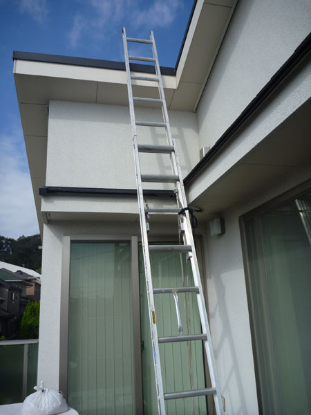 自宅へ戻って、2階のテラスから屋根に脚立を架けます。登っているときに倒れるとそのまま地面まで落ちるので軒下に付けた金具にしっかり固定しています。