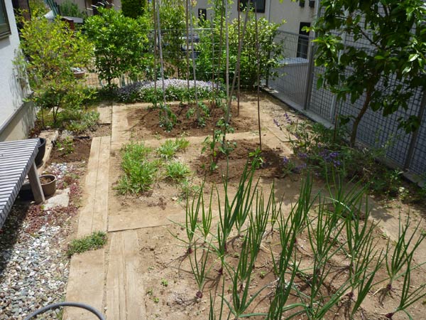 支柱を組んで、トマトや甘長とうがらし、ハーブなどを植えました。