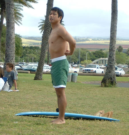 2002年の年末。ハレイワビーチパークでの写真です。かたわらのボードはクリス・クリステンソンのフィッシュ。顔をしかめているのは腰痛のせい(自分で指圧してます)。