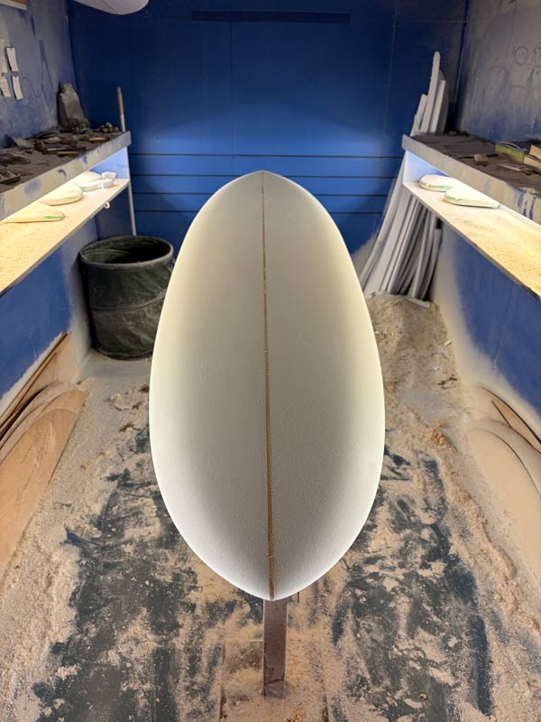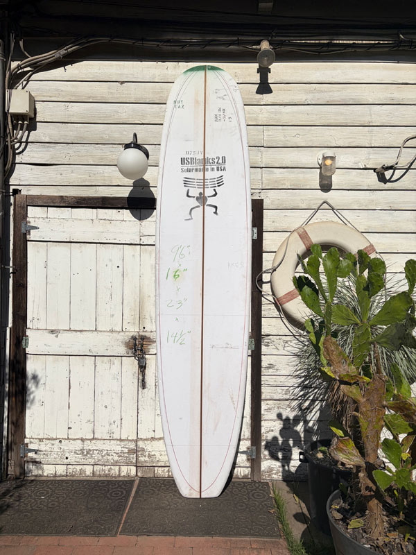 シェイプルームのラックに乗った、いくつかのシェイプの中でひと際目を引いていました。9フィート6インチでシェイプしていただいたプリモです。このサイズになってくると、グライダーと呼ぶ方がしっくりきます。