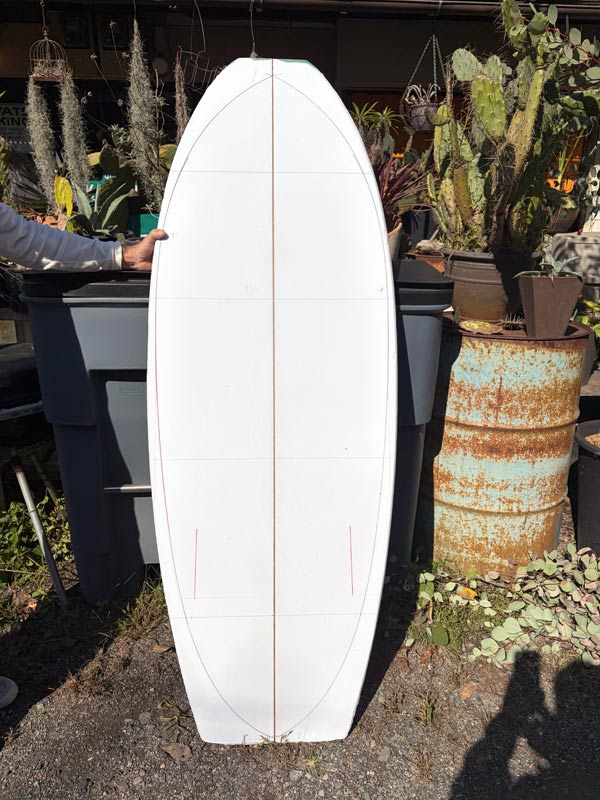 フィンはシングル。ボトムはハルベースで、センター付近はフラットか浅いコンケーブ。レールとの境目にエッジを入れたらどうだろう?と考えています。