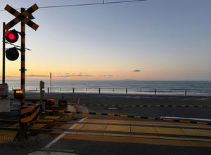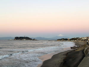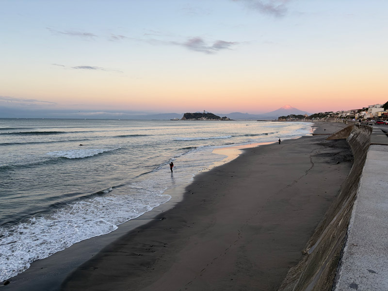 日の出直前。冠雪し始めた富士山の頂が赤く染まって、赤富士になってます。いくつかの台風を経てきましたが、ビーチの砂はたっぷりと残ったままです。いつもの冬の海が戻ってきた感じです。