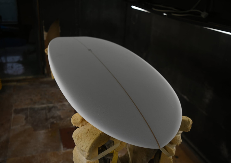 ニーボードのボトムはいつもコンケーブががっつり入りますが、それもありません。チャネルボトムには、活さん自身の経験に基づいた形状のレールが組み合わされます。これは私が活さんのシェイプを見始めた当初から変わらない形です。