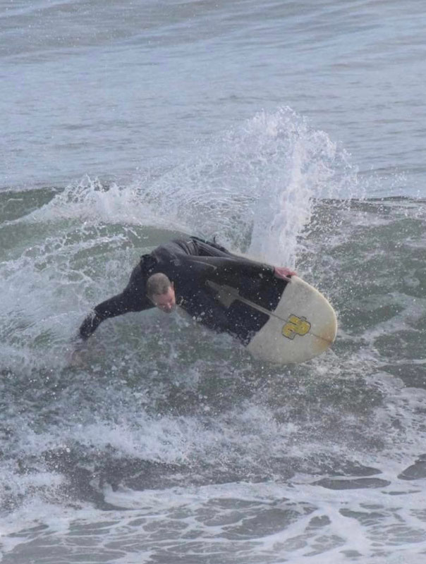 動きはトライフィンよりも反応は遅くはなりますが(柔らかくなる、スムースになるとも言えます)、ニーボードならではのシングルフィンの動きがあります。シングルフィンでも、ノーズまでレールが入ったこんなターンが出来てしまうのがニーボードの面白さと言えます(トライフィンはもちろんです)。