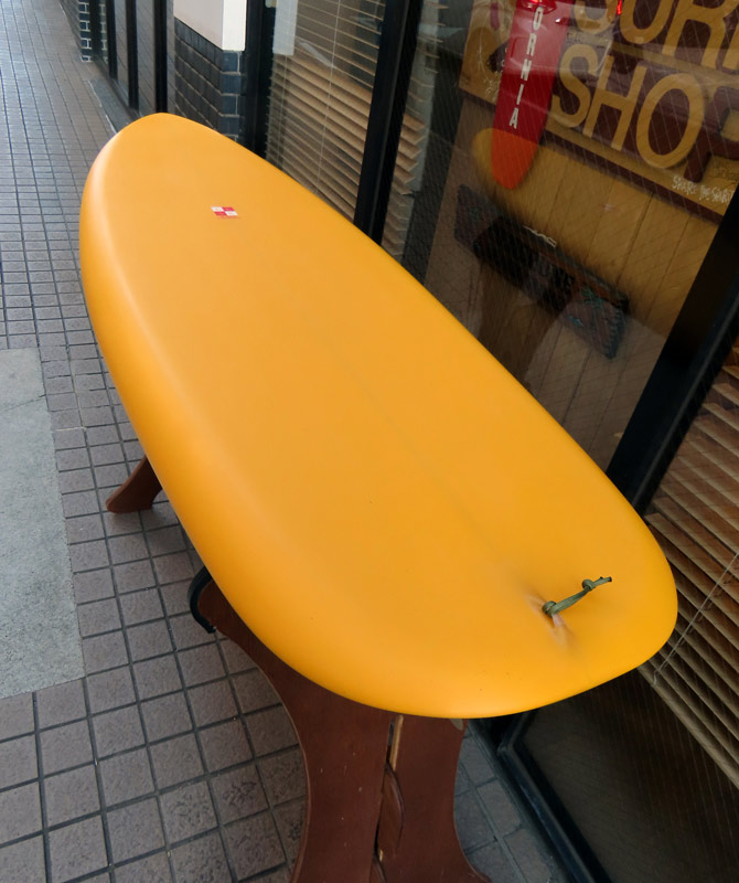 正面から見るとこうなります。68-9年にシェイプされたボードの復刻です。シェイプは当時のオリジナルをシェイプした川南正さんによるものです。