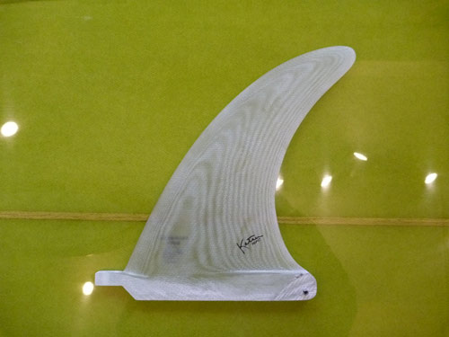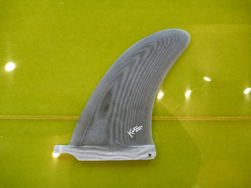 9’9”グライダーのフィンはこんな感じです。高さ(エーゴでは「深さ」という表現になります)は、10インチ。いまさら言うことでもありませんが、サーフボードにとってフィンは重要なパートのひとつです。フィンひとつで、ボードの性格が大きく変わったりすることはよくあることです。