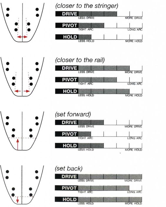 上のふたつはリアフィンの左右の位置で、下のふたつは前後の位置の変化でボードの性格がどう変わるかを表しています。