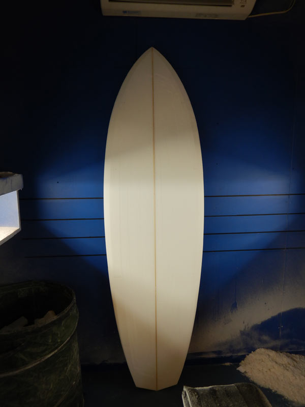 ラウンドノーズのダイアモンドテール、二本シェイプされていました。どっちにしますか?と聞かれ、5’8”のニーボードにボトムがより似ているように見える左側を選びました。もう一本もテストボードです。