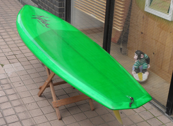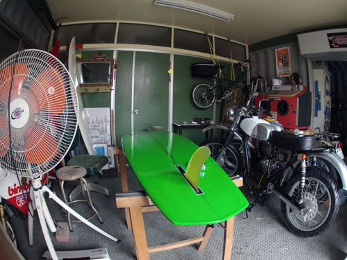 さて、先日カツさんのシェイプルームにお邪魔したときに今考えていることをいろいろとご相談させていただきました。ひとつは上の写真のグリーンのシングルフィンをボンザーにしてみようということです。