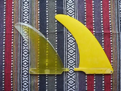 最初に使っていたフィン(小さい方)は、なんとなくいかにも70年代風というイメージです。高さの分だけレイクが少ないせいか、ボードがくるりと回ってしまう感じで何か物足りないものを感じていたのですが、細長いフィンにして後方にフィンが1インチ程度伸びただけで、ターンしている間ずっとホールドしてくれている感覚がありました。(追記:それぞれのフィンに長所と短所があります。後のブログで解説しています。ちなみに最終的に使っているのは(小さい方)でした)