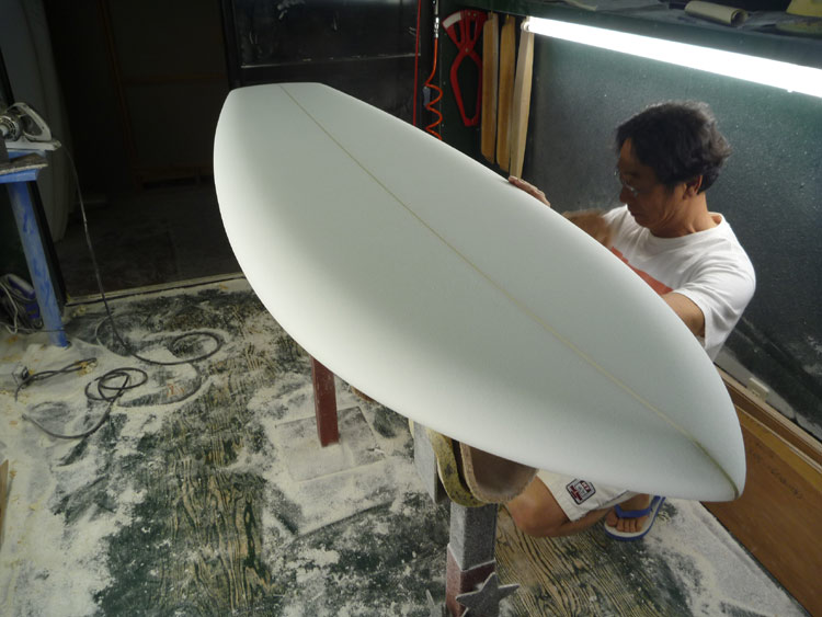 そもそも突然にこのサイズのシングルフィンを作ろうと思い立った理由は、自分の波乗りのスタイルを見直してみようと考えたからです。ご存知のとおり私はログのスタイルにあこがれてロングボードで波乗りをはじめました。ロングボードからクラシックつながりでトランジションタイプのボードに興味を持ち乗り始めたのは2001年ごろからです。