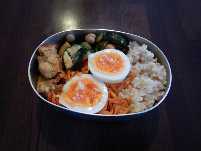 今日のお昼は、鶏肉とタケノコのスパイス炒め、ズッキーニとナスビと豆とピクルスのバジル風味オリーブオイルマリネ、ニンジンのカレー風味ごま油和え。それにゆで卵と玄米ご飯。全部自分で考えて作りました。クリエイティブでしょ。