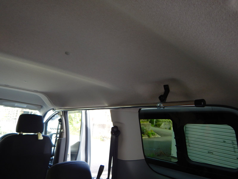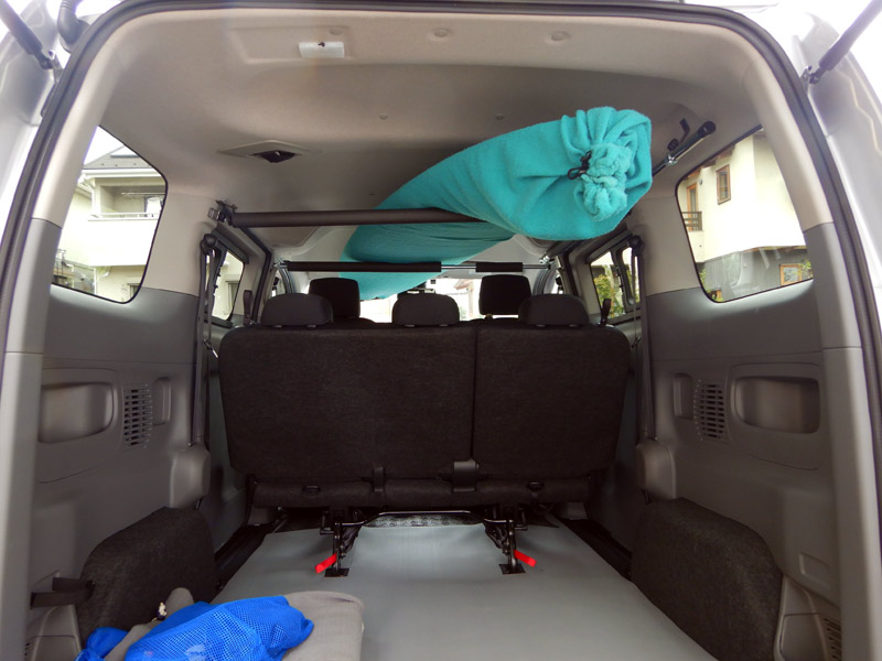 ルーフのキャリアを取り付けて、次は車内のキャリアです。自分のアタマの上のスペースを使ってボードを収納するのですが、少々問題があります。私のNV200はバン(商用車)ではなく、ワゴン(乗用車)です。バンは車内の内張がなく、鉄板のネジ穴などがそのままなので、それを利用していろいろと取り付けることができるのですが、これがワゴンになると、すべと内張に覆われて、取り付ける部分がほぼありません。
