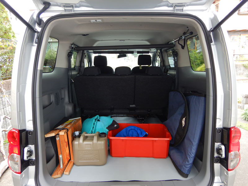 とりあえず、いままでの荷物を積み込んでみました。カングーと比べると、かなり余裕があります。床のエンボスシートのおかげで、空のポリタンクはカーブを曲がっても動きません。なかなか良いです。