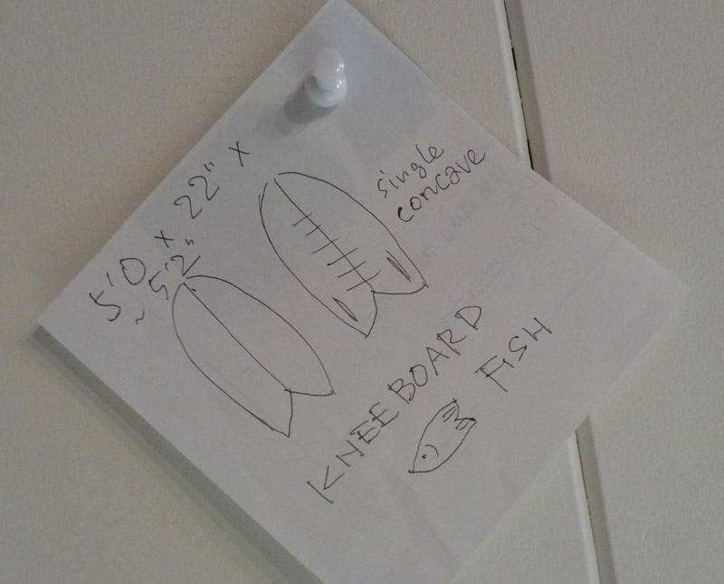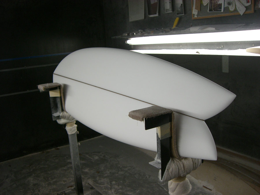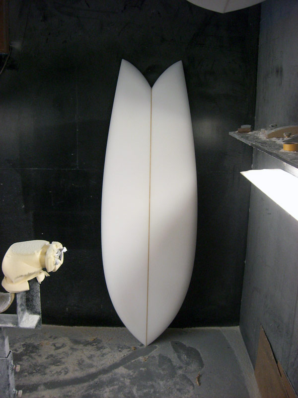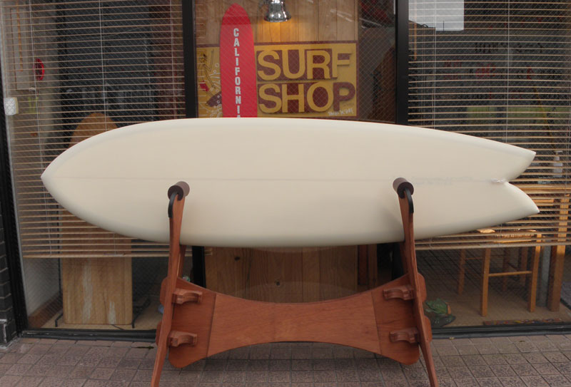 出来上がったばかりの、6’10”フィッシュ。シングルフィンのプリモと同じロッカーのブランクスを使って、レールとボトムのシェイプも同じなので、プリモフィッシュと呼ばれています。