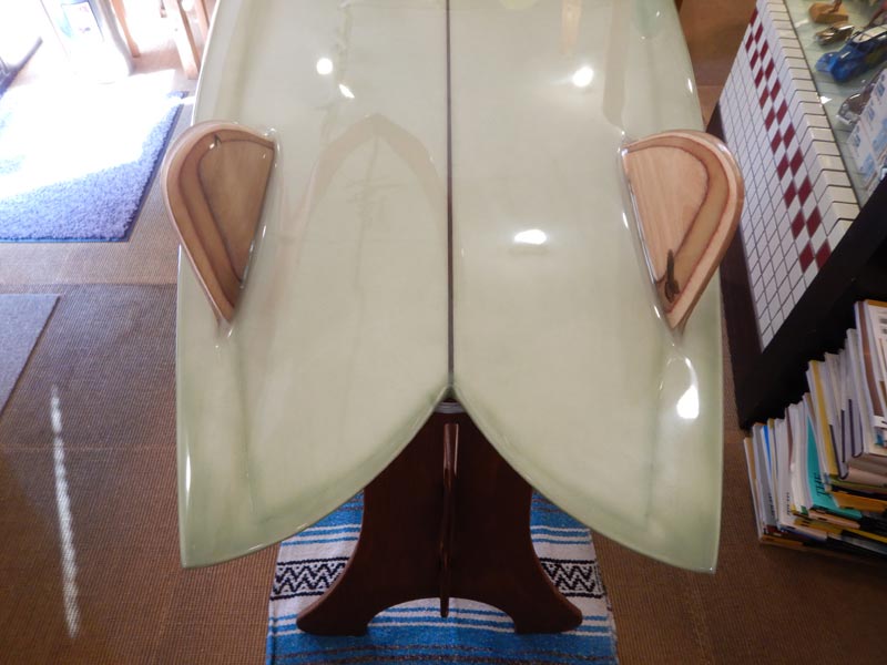 フィンは大きな三角形のキールフィン。シングルフィンと同じ両側とも曲面に削られたフィンがフィッシュテールのかなり後方に、真っすぐグラスオンされます。ボトムはシングルコンケーブ。