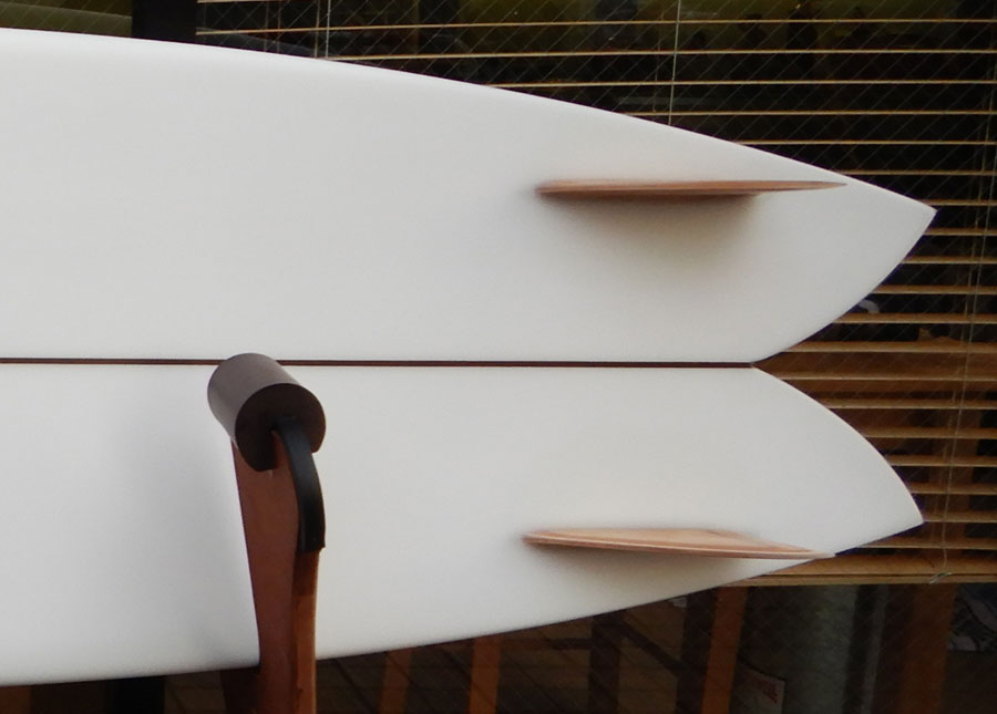 フィンはやっぱりダブルフォイルです。テールまで幅広のパラレルなアウトライン、ボトムはシングルコンケーブ、それにダブルフォイルのキールフィンで6’8”の長さですから真っすぐ進みたがる傾向はどうしても強くなります。それを多少緩和するためにコンケーブの量とレールの形を調節していただきました。
