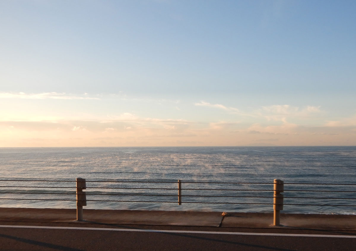 急に冷え込んだ朝でした。海面からは蒸気霧が立ち上っています。北国では、「けあらし」と呼ばれます。