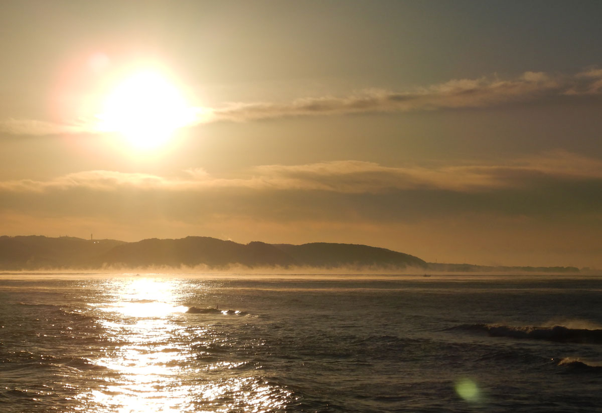 すぐに消えてしまいましたが、幻想的な光景でした。朝日に照らされて、波も金色です。