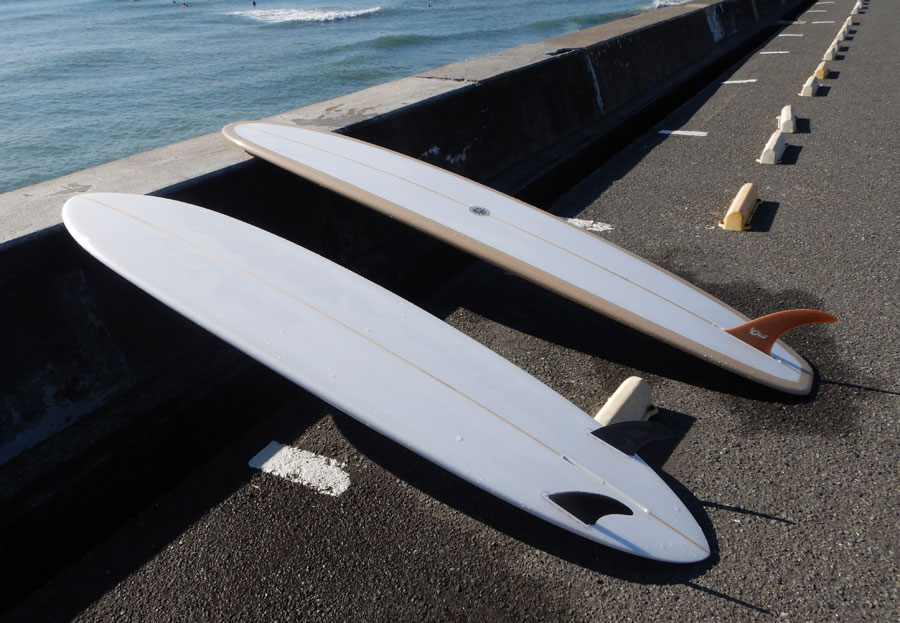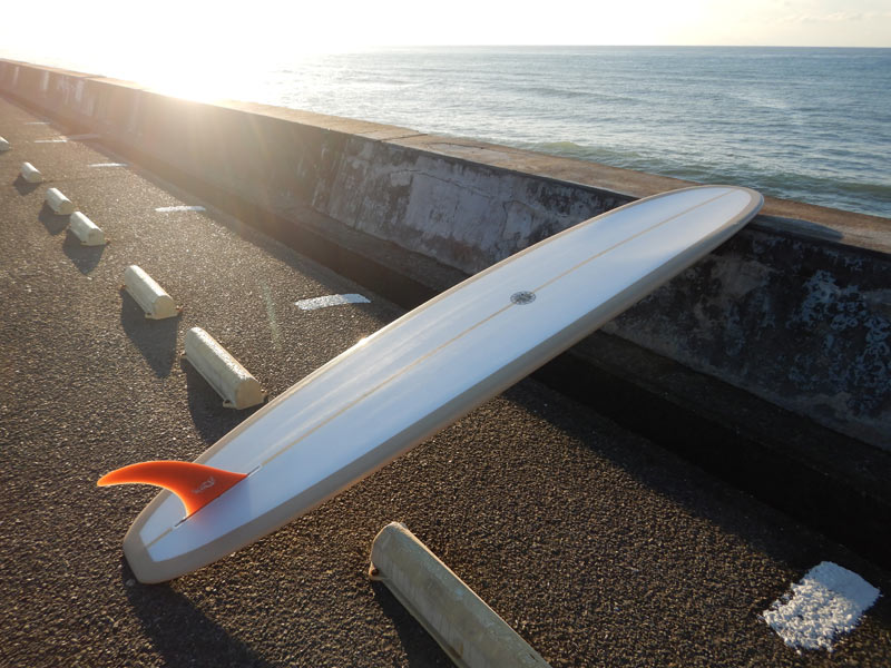 重たいクラシックなログは身体に故障が出てきたりと、いろいろ大変になってきたこともあって、8フィート前後のプリモやフィッシュ、ニーボードばかりやってましたが、やっぱりロングボードで背筋を伸ばしてのトリミングもやりたいと、作ってもらったのがこのボードです。