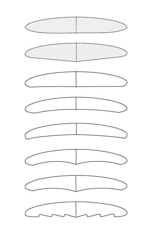 5番目はホットマンゴーやニーボードなどに近い形状です。レールとコンケーブの接点では、エッジがより強調され、反応がより敏感になります。以前、好んで乗っていたシングルフィンのダブルエンダーというモデルもこの形でした。レールがサイドフィンのように効いてくれるので、センターフィンは小さいもので十分にその機能を発揮してくれました。同じコンケーブでも形の違いで性格が大きく変わってくるのが良く分った経験でもありました。