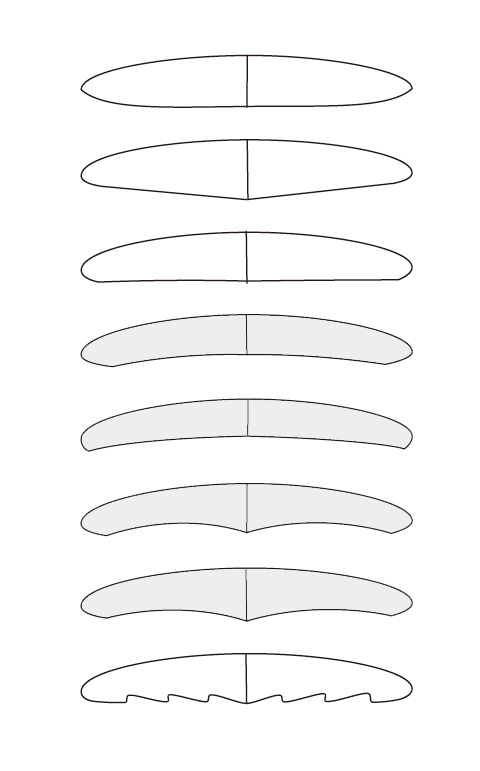 6,7番目はダブルコンケーブ。ボトムの水流をストリンガーを境にして左右に分けることで、コンケーブのスピードに、レール to レールの動きをミックスさせています。AC SHAPEのグライドボトムがこれです。VEEをプラスするとマニューバ性能がより向上します(7番目)。