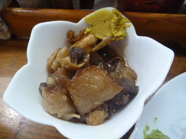 これはつきだし。しょうゆで甘辛く煮付けたようなホルモン。これもおいしい。