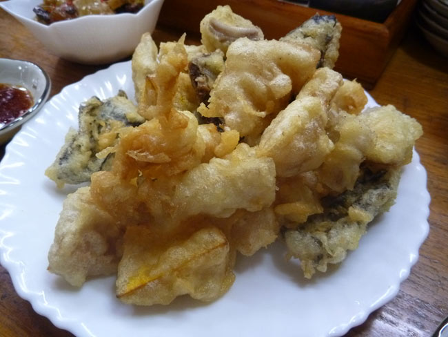 これ、ホルモンの天ぷらです。センマイ、ガツ、ギャラなど柔らかくゆがいたか、揚げたかで脂が抜けたものを天ぷらにしています。