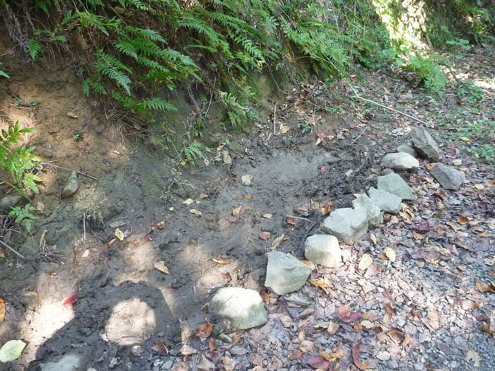 途中、こんなのを発見。近づいてみると、ヒズメの跡と泥の表面に毛皮を擦り付けた跡が筋状に残っています。イノシシのヌタ場です。そういえば子供の頃、山からイノシシが降りてきて騒ぎになったことを思い出しました。