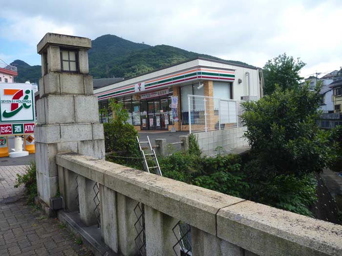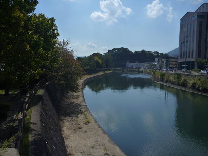 正面に見えている山頂に鉄塔が立っている山が稲佐山という、夜景を見にいく有名なスポットです。河が流れる先に港が少しだけ見えています。