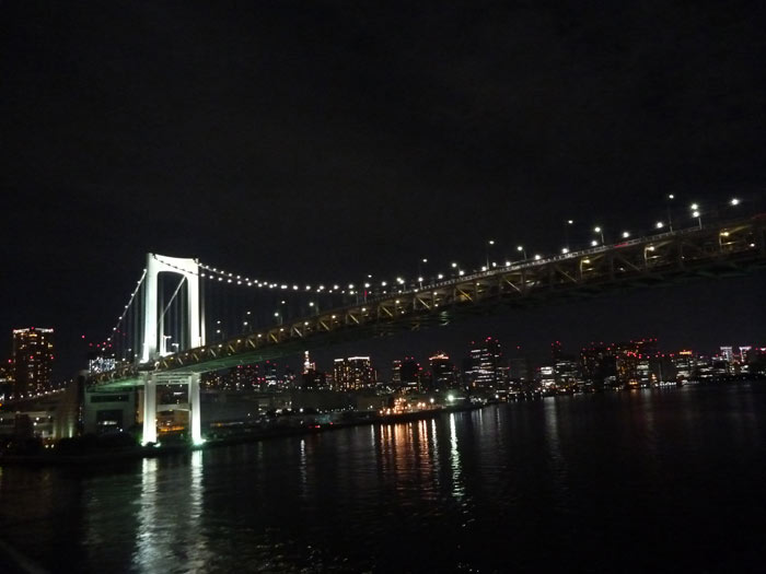 レインボーブリッジをくぐりぬけ出航。東京の夜景、結構好きだったりします。夜間発着の旅客機を眺めながら羽田沖から海ほたるの横を通り抜けていきます。船ならではのスピードが気持ちいいです。